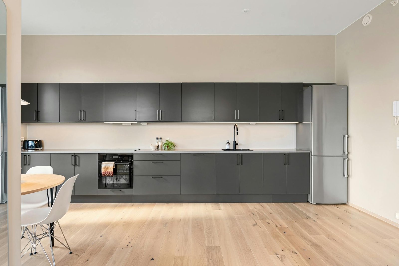 مطبخ ألمنيوم رمادي مع أسطح من الرخام الصناعي