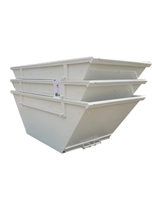 حاوية حديد مصنوعة من صاج أسود سابك سماكة 3 ملم للجوانب والأرضية والأمام والخلف، مزودة بجسر علوي U-Channel مقاس 50×100 ملم وزوايا أرضية 444 ملم. تحتوي على 4 خطافات جانبية قطر 32 ملم للرفع باللودر، وهوك خلفي مقاس 808 ملم مع مبروم 32 ملم لتسهيل التفريغ. مزودة بسيخ تفريغ 32 ملم مع لحام كامل داخلي وخارجي لتحمل أقسى ظروف العمل، وتُفرغ بواسطة سيارات المكابس.